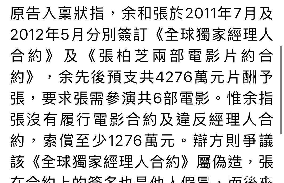 算下来,张柏芝总共拿到了余毓兴4276万的片酬,按照合约本应拍摄六部电影。不过,余毓兴表示,她一直没有完成合同里的电影任务,又违反了经理人协议,所以他要求她赔偿至少1276万元,还得把2015年5月至2019年间的收入明细公布出来。